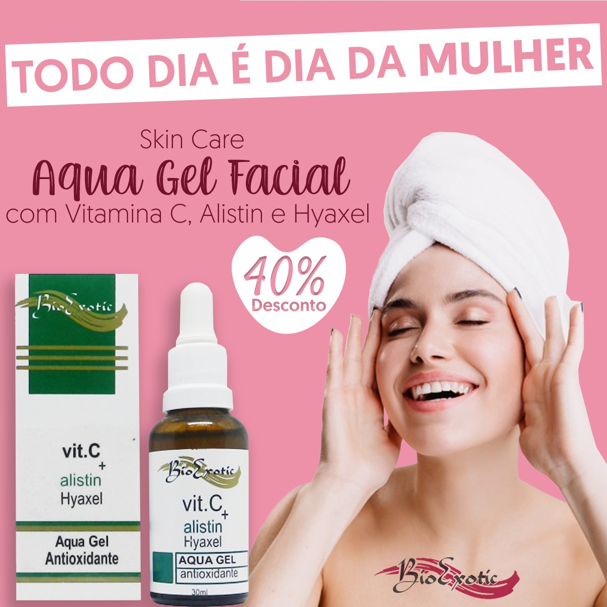 O produto que nós indicamos com esse composto aqui na BIO EXOTIC é o Aqua Gel Facial com Vitamina C, alistin e hyaxel.
